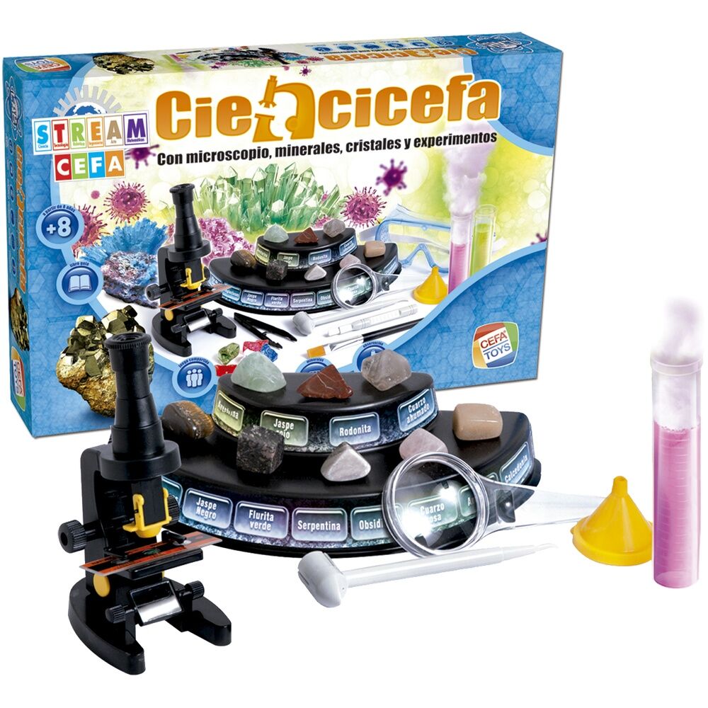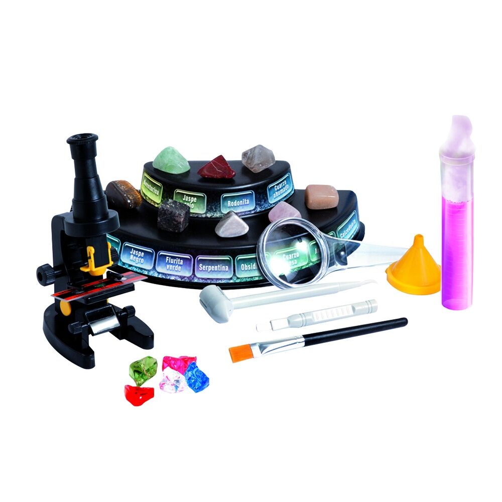 Edad: +8 años. Contenedor de Plástico Grande. Contenedor de Plástico Pequeño. Pincel Para el Polvo. Herramienta de Excavación. Lupa. Sulfato de Potasio de Aluminio. Pinzas. Palito. Pipeta. Gafas Protectoras. Arena. Limadura de Hierro. Portamuestras. Microscopio. Embudo. Bloque de Excavación con Rocas y Minerales. Hilo. 2 Vaso Medidor con Tapa. Goma Elástica. Globo. Imán. Tubo de Plástico. Probetas. Expositor para Minerales.