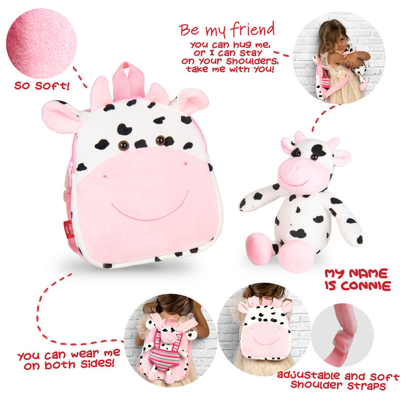 • Peluchito Vaca Connie: Incluye un adorable peluche de 25 cm en forma de vaca, que se puede usar como compañero de juegos o como un suave accesorio para la mochila.
