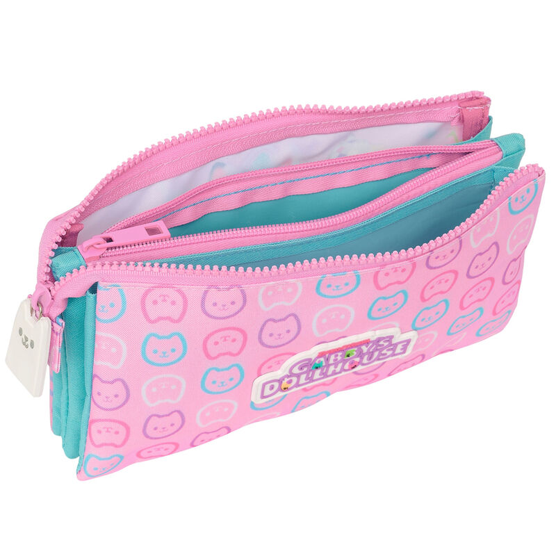Tamaño: 22x3x12cm. Con 3 compartimentos separados con cremallera. Bolsillo interior central con cremallera.