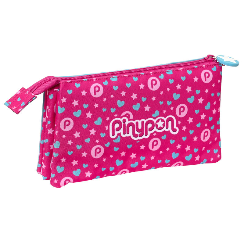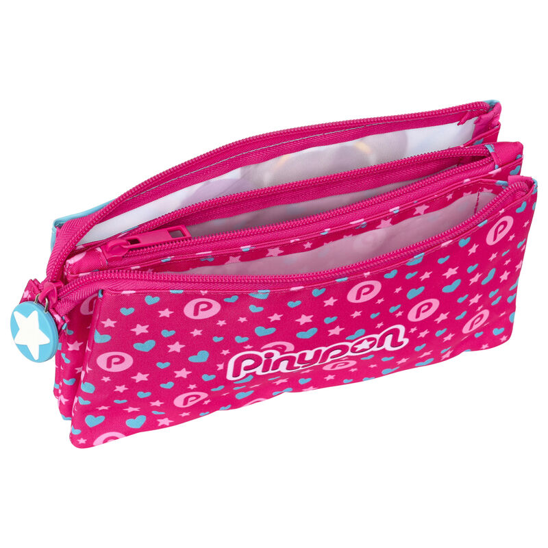 Tamaño: 22x3x12cm. Con 3 compartimentos separados con cremallera. Bolsillo interior central con cremallera.